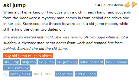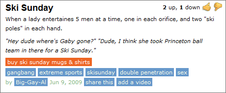 If by this point you have started to suspect, even through the mad rantings of the Urban Dictionary editorial team, that skiing is a winter sport similar to snowboarding, I'm afraid you are sadly mistaken. I can reveal that skiing is in fact a series of increasingly complicated and grubby sex acts. It turns out that skiing is essentially an extreme sport version of the the Kama Sutra. Get ready to learn some things you'll never be able to unlearn...