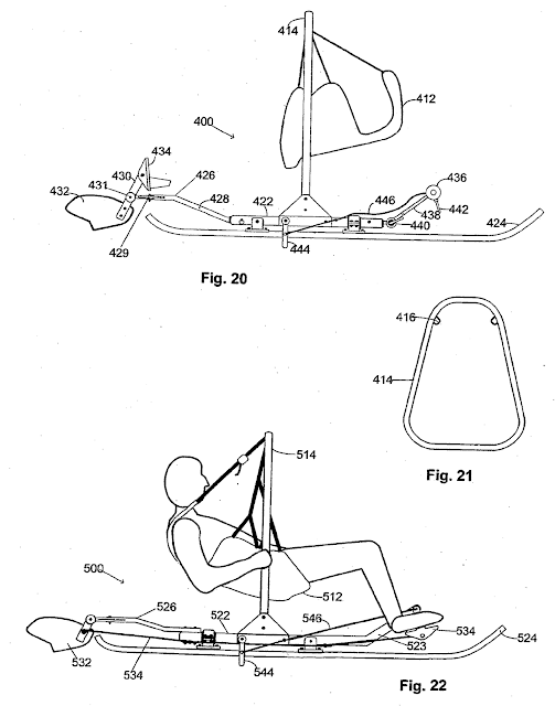 Interestingly in their various applications the other referenced patents aren't snowboarding, instead they seem to have been inspired by a series of patents for snowblade precursors, including this beauty. It undermines the positioning of their product as an improvement on snowboarding when it was inspired by feet buckets.