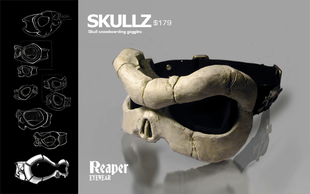 "Skullz Snowboard Goggles - The first concept are snowboard goggles mimicking the look of a human skull. Initial sketches were literal interpretations of a skull turned into goggles. However, several variations led to a more refined design which takes certain characteristics of the skull to give the goggles a skeletal and bonelike appearance. These goggles are designed to appeal to the crazy wild extreme sports segment of the market."
